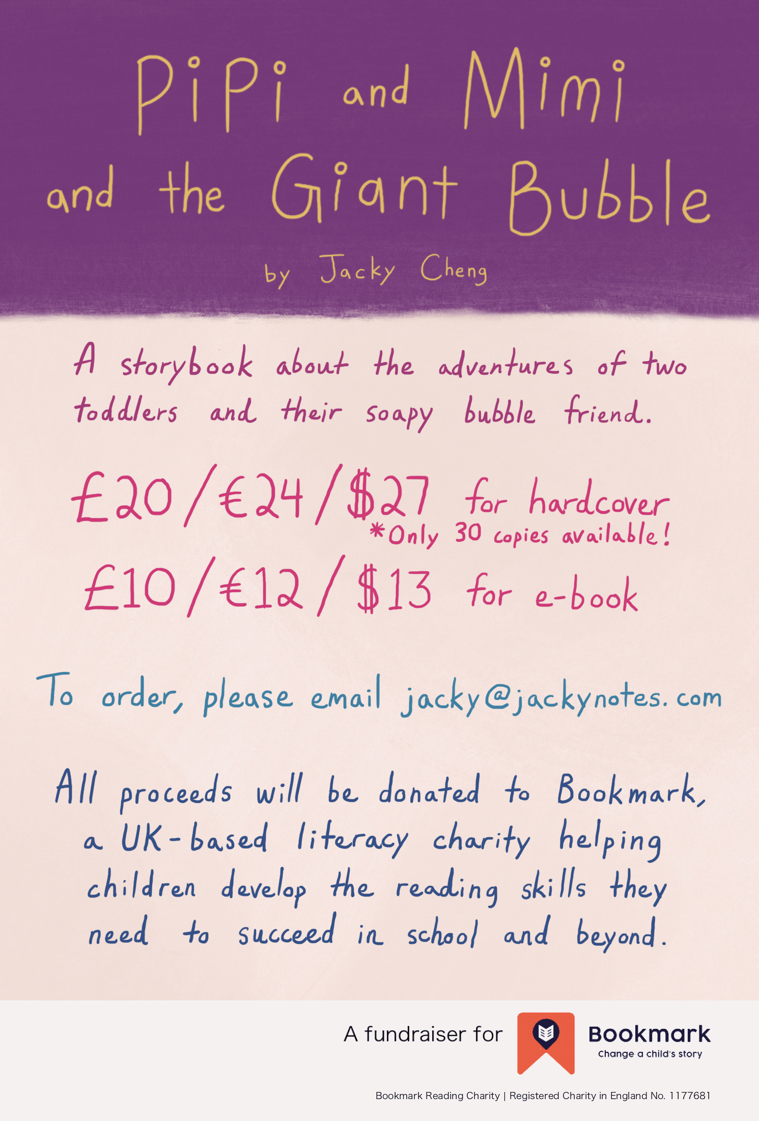 For the campaign, I am selling both hardcover and e-book copies of the storybook, with 100% of the proceeds going to Bookmark. The prices are listed below, but you can of course donate more if you’d like! I will be combining the payments to make a single donation that will be matched 1:1 by my work place.